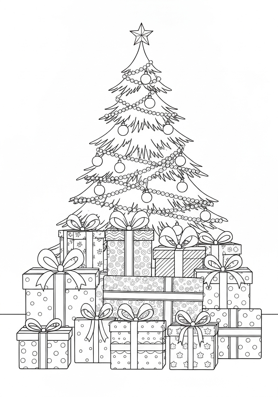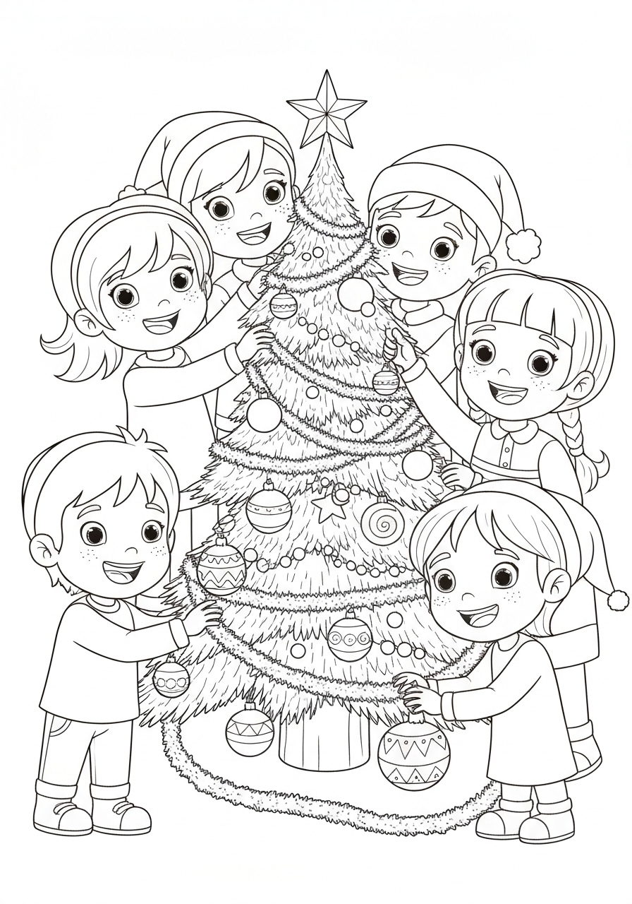 Kids love decorating their own tree — why not color one too? This page captures the magic of hanging ornaments and topping it with a shining star.