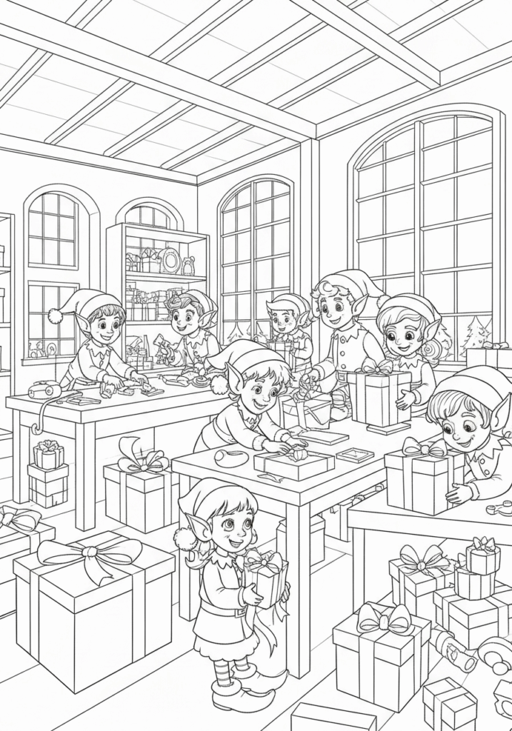 Little helpers hard at work! This coloring page shows the North Pole magic of toy-making and wrapping.